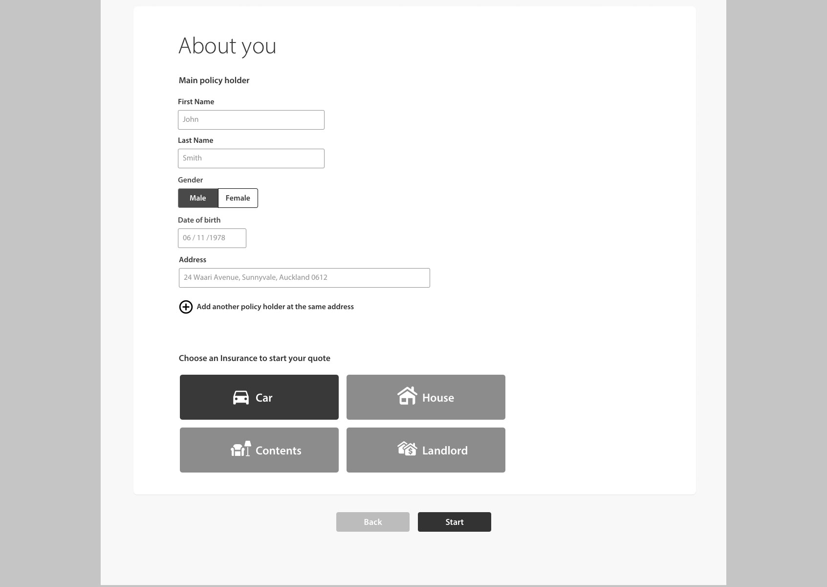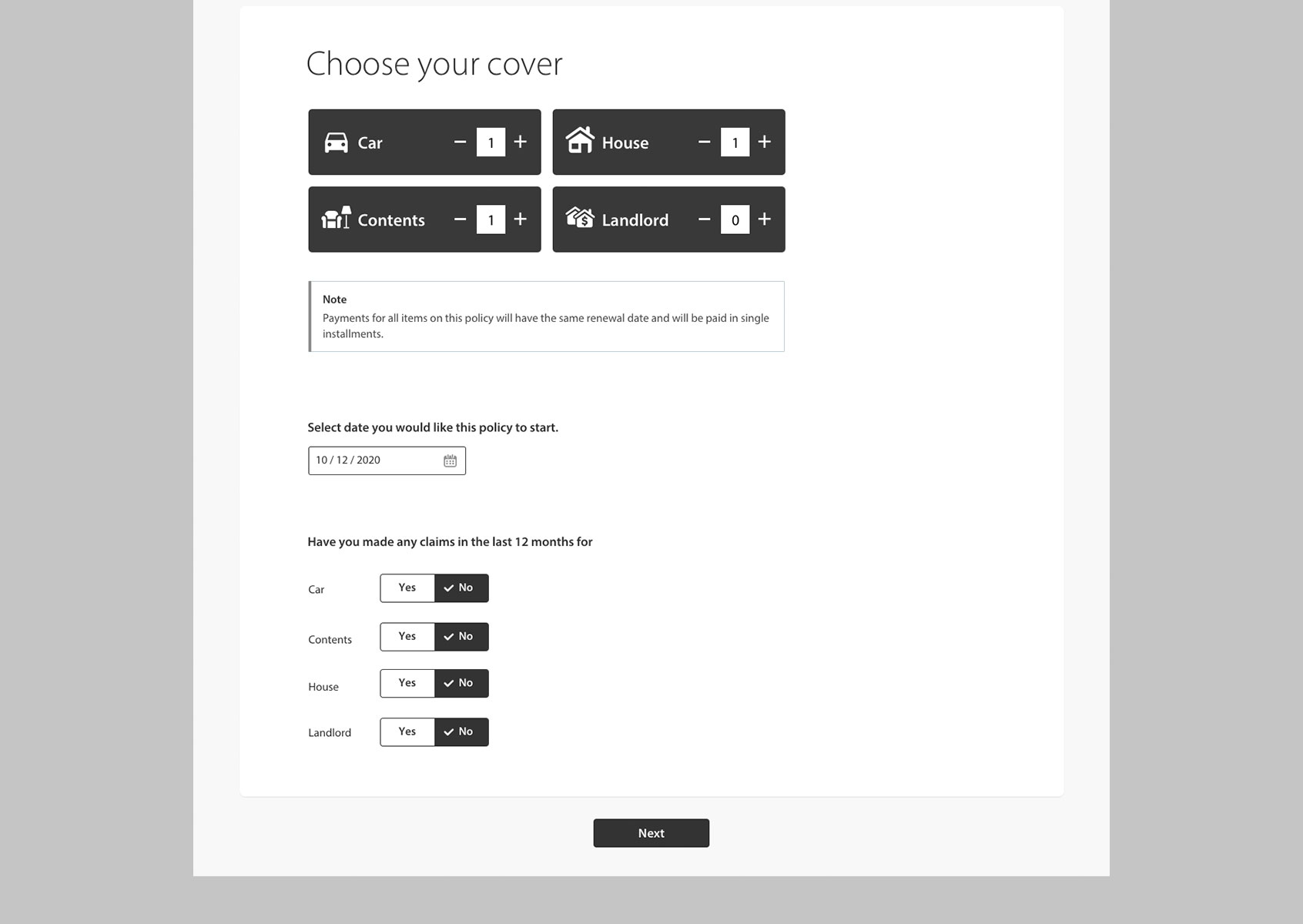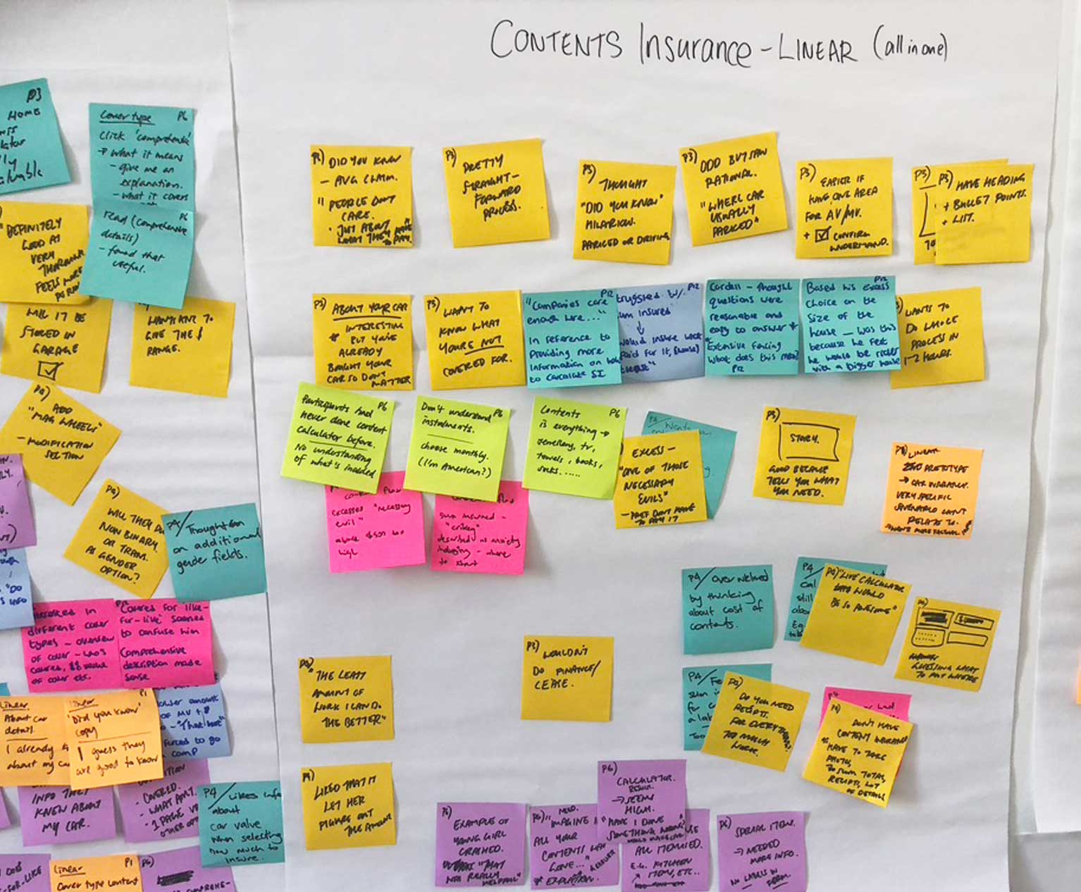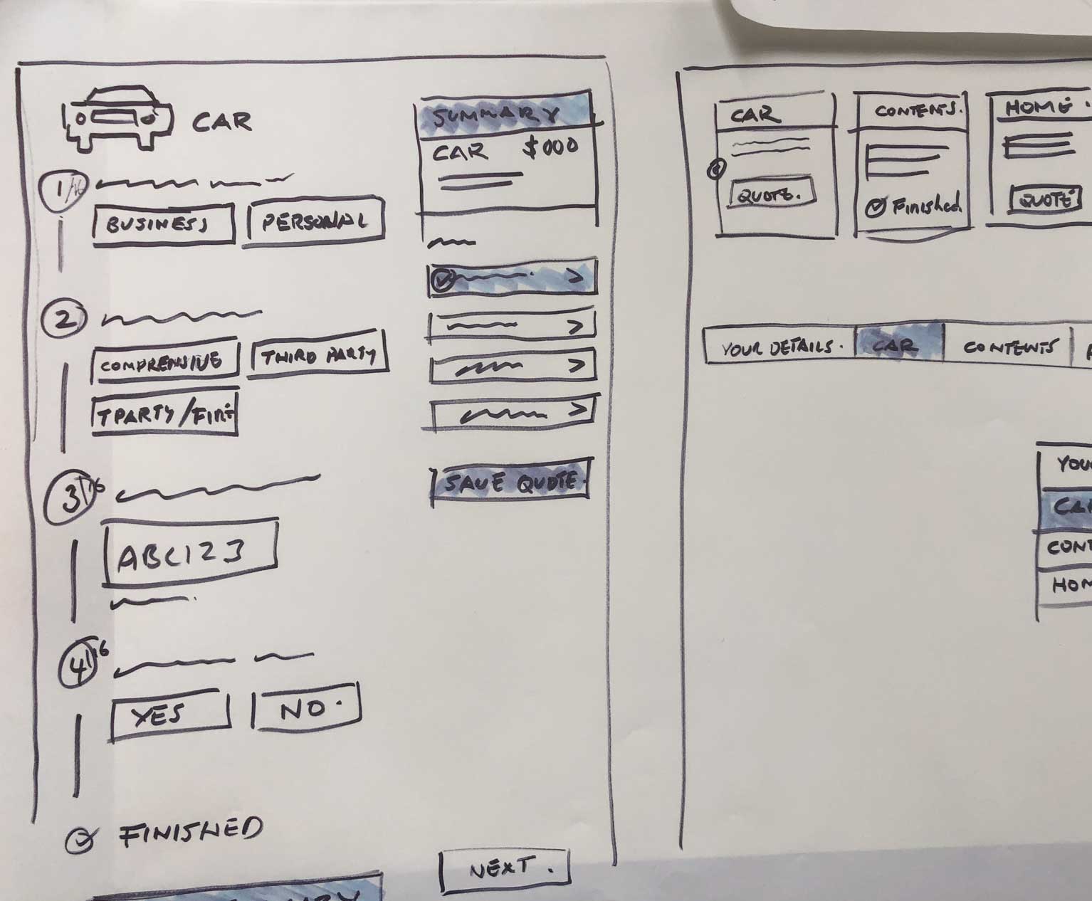 Some user testing and research had already been done on a single product insurance onboarding journey, so firstly my job was to get up to speed & immerse myself in the findings from this initial project. From that point, I could start looking at developing the multi policy insurance journey. I also took part in workshops to understand and start developing the user journey. This consisted of studying the product requirements, diagramming, journey mapping, user flows and hand drawing out wireframes.