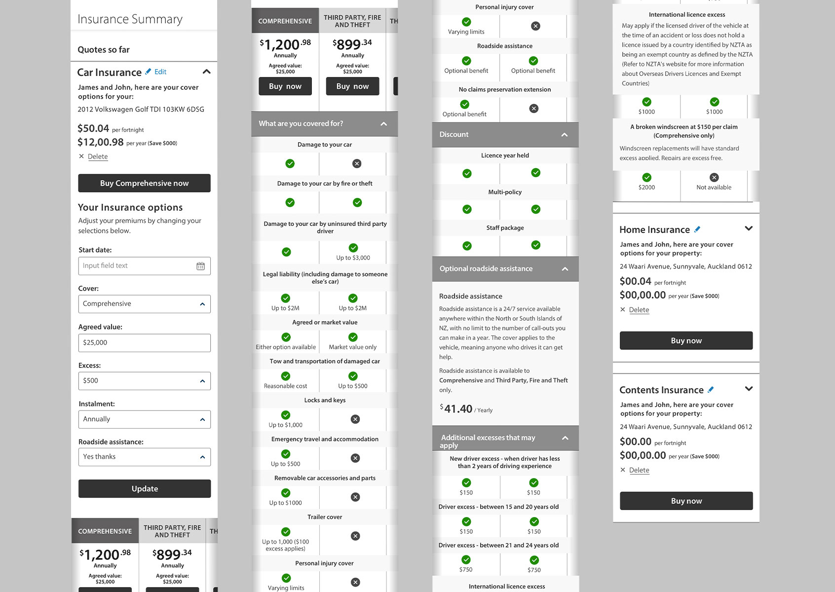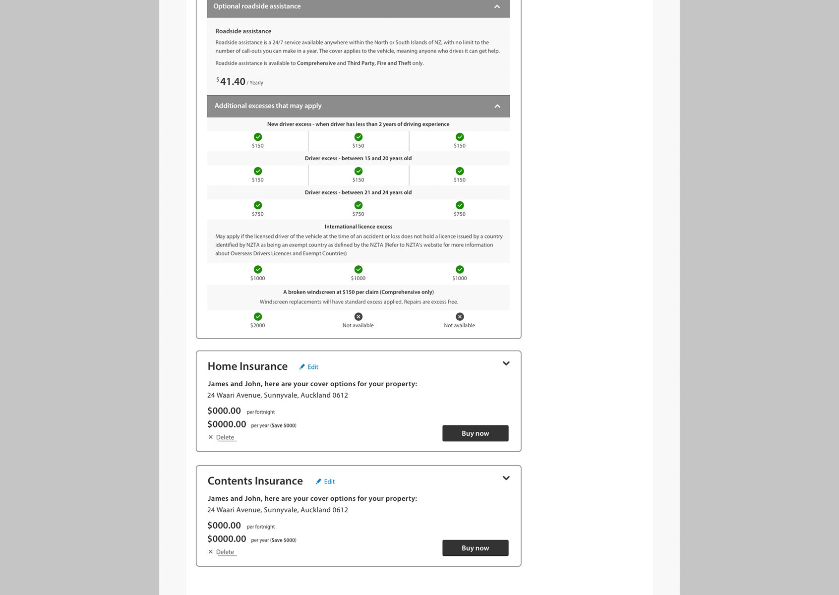 I was also tasked with building in Sketch, any mobile components that contained new patterns that I had previously developed. The summary page presented a unique challenge. The user arrives at this page on the end of the onboarding journey for their insurance choice. The car insurance summary contains a comparison tool where the user can select one of the three insurance categories, compare the cost and look at what each one offers or doesn’t. The information is displayed in a table and on the desktop the user can see all 3 category comparisons at one glance. The challenge was to make this work on a mobile and have the tool work effectively within the screen restraints. With a few design variants explored, I arrived at a horizontal scroll solution, where the user can select a category and still see at least 2 columns of comparison displayed on screen at one time. They could then swipe left or right to view the third column. (See the example above)